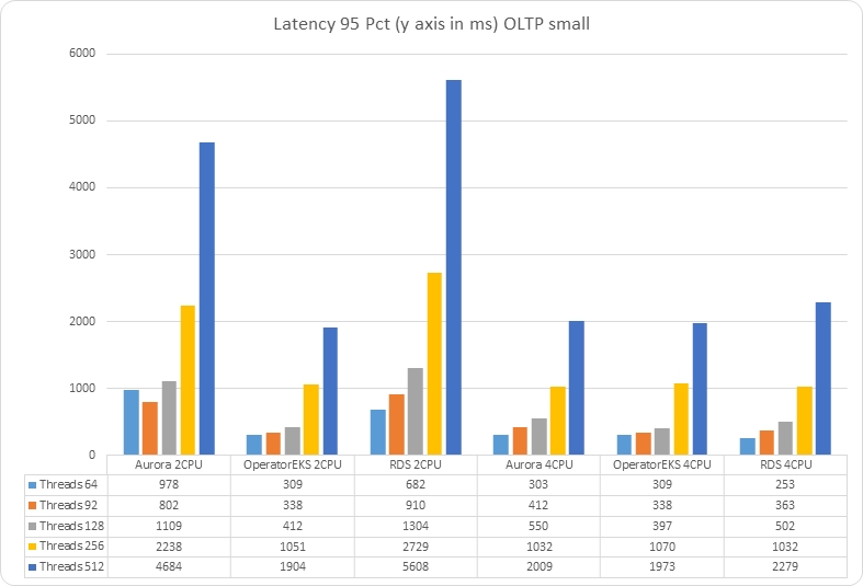 As you can see the solution using the Operator is overperforming in the case of small and large datasets. While AWS solutions are still suffering from the same CPU limitation we have seen in the read only load.
